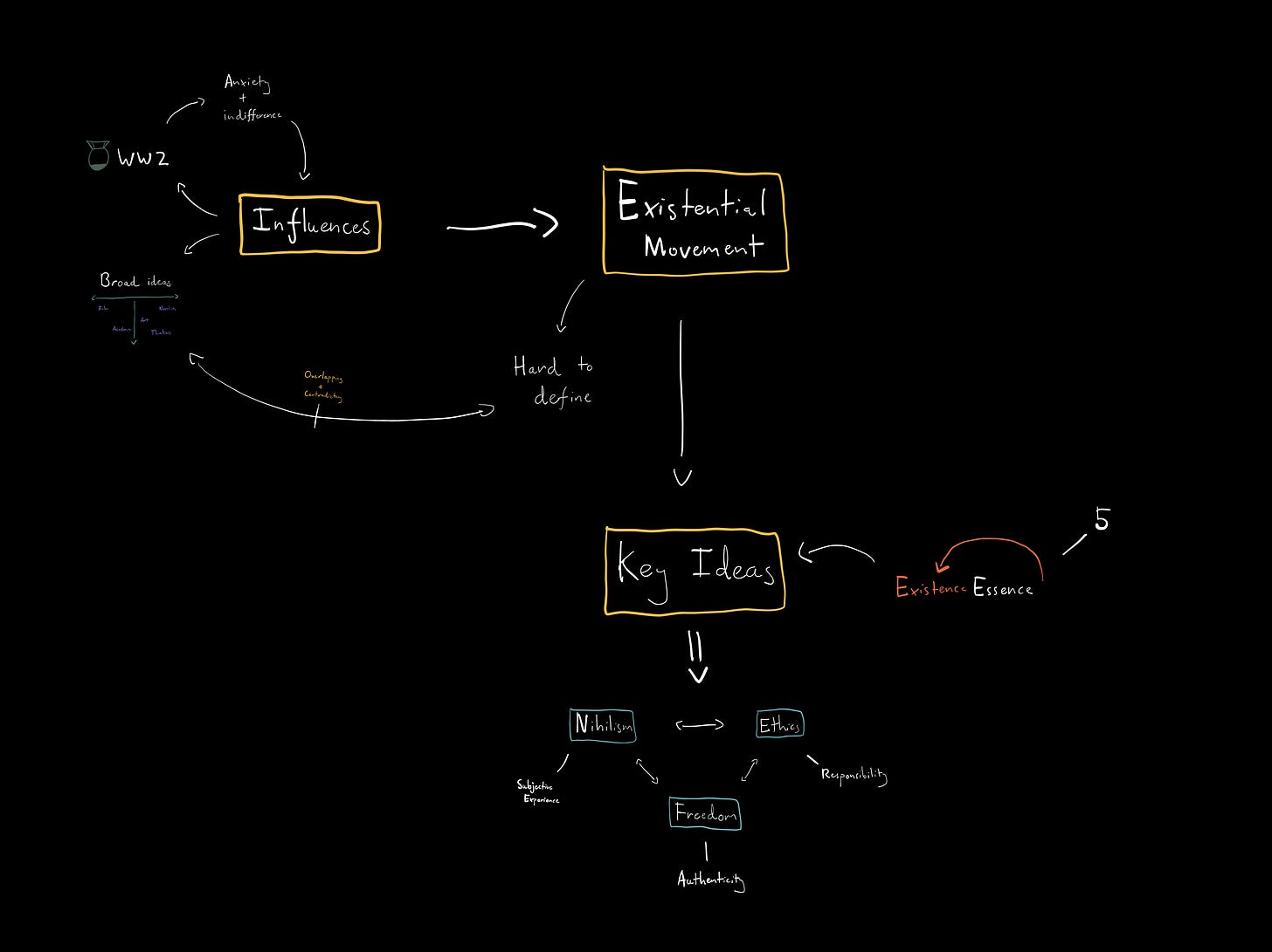 The three that feel most central to me right now are nihilism, freedom, and ethics. All of which are fueled by the idea of existence precedes essence, which I don’t fully agree with.