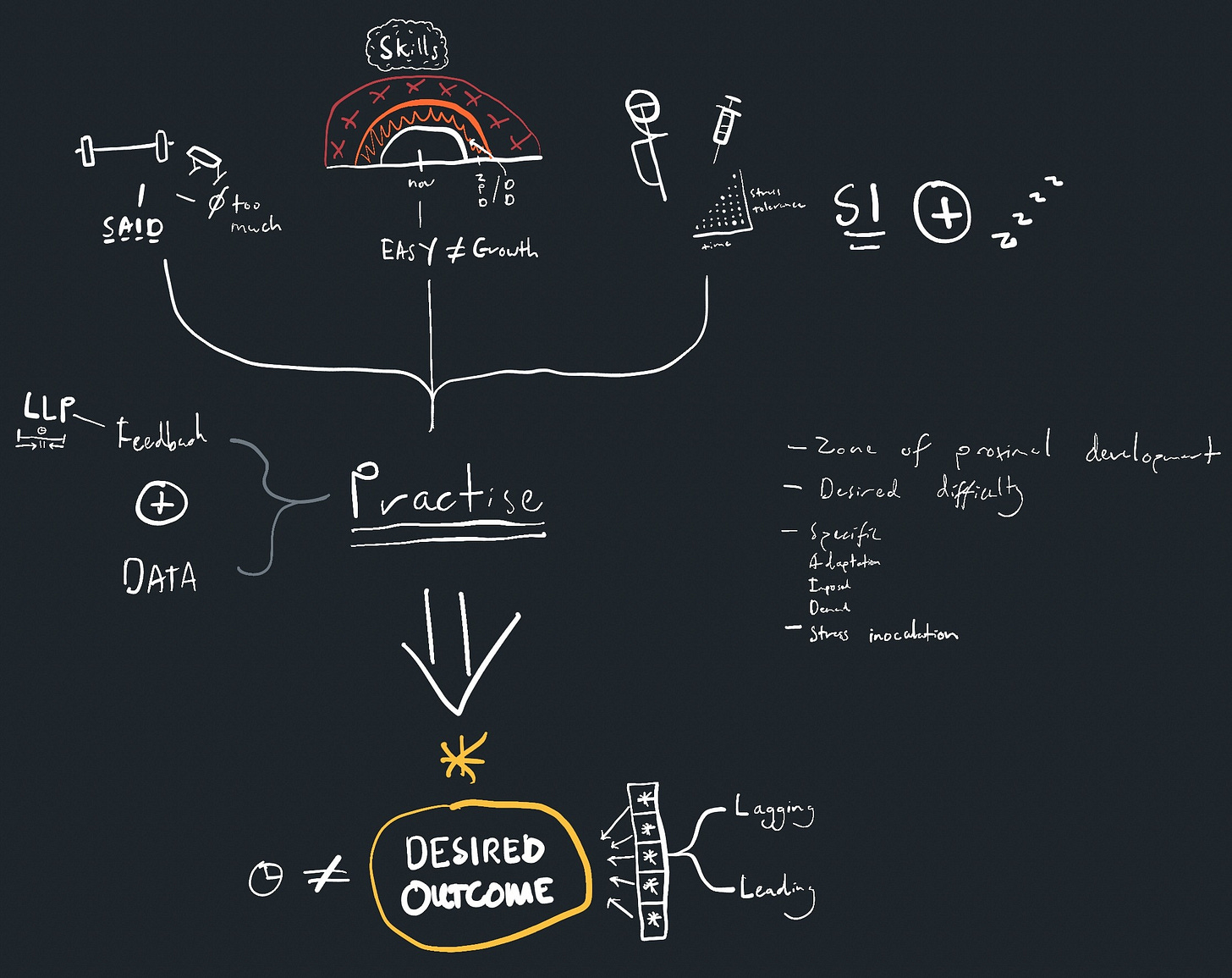 This step on consolidation is about being able to understand and comprehend information inside your own head. That’s why there are very few notes on the mind map above. For example, I know that LLP means “latent learning period.” It’s just inside my brain and not on the page, which is what truly matters. That symbol beside the injection is a reference to the TOOL album Fear Inoculum, reminding me about fear inoculation and how it improves stress tolerance. In simple terms, do lots of something and you will get more comfortable doing it.